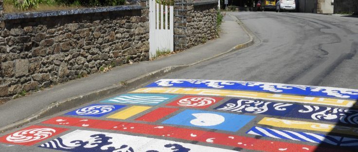 La municipalité s’est appuyée sur une palette réglementaire de dispositifs simples et peu coûteux, et dont l’efficacité à réduire la vitesse des automobilistes a déjà été démontrée : en centre bourg, la zone de rencontre prend forme : des panneaux ont été déplacés, d’autres ont été enlevés, au profit d’une signalétique spécifique aux différentes entrées ; les marquages au sol sont progressivement effacés ou recouverts par des fresques colorées, la priorité à droite devenant la règle.