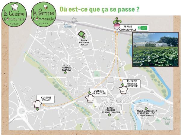Localisation de la ferme municipale et des cuisines et écoles. Visuel de la mairie d’Auray.