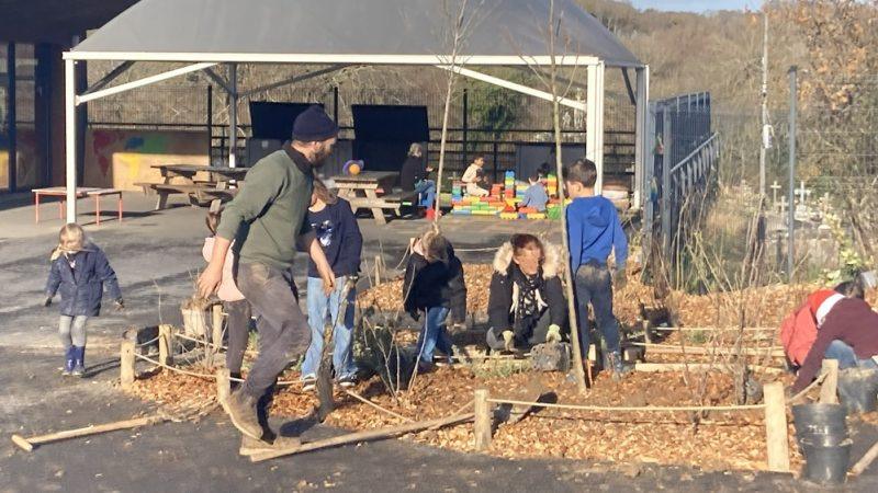 Trois bancs et deux cabanes en bois seront disposés dans la cour. Fabriqués par Bivouac, le chantier doit se dérouler en janvier 2026. Ils permettront, comme les troncs d’arbres disposés en arc de cercle, de faire l’école en extérieur aux beaux jours. Un cheminement réalisé avec des pierres plates récupérées dans le matériel des services techniques remporte un vif succès auprès des enfants.