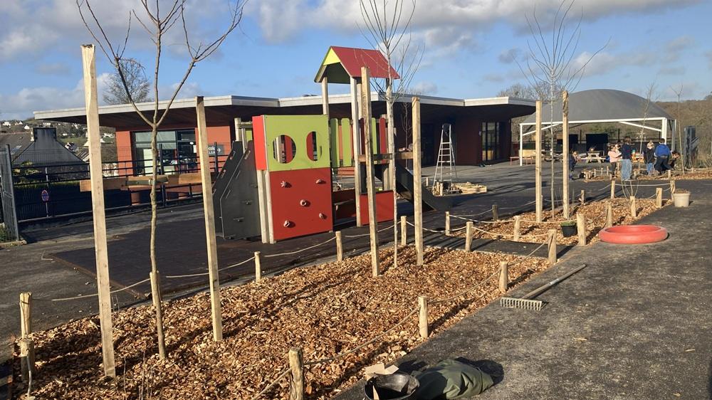 Le grillage qui entoure la cour sera bientôt couvert d’une végétation grimpante et deux arbres ont été plantés à l’extérieur de la cour sur le chemin vers la cantine.