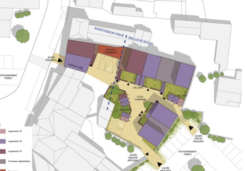 Le fait de porter l’étude pré-opérationnelle a facilité la recherche d’un porteur de l’opération. En effet nous disposions déjà d’un programme et d’une esquisse architecturale, ce qui permettait de témoigner de la faisabilité du projet. Cela nous a aussi permis d’identifier les besoins au plus près du terrain, et de bien définir les objectifs de ce projet : intégration architecturale, connexions piétonnes, espaces extérieurs pour chaque logement, etc.