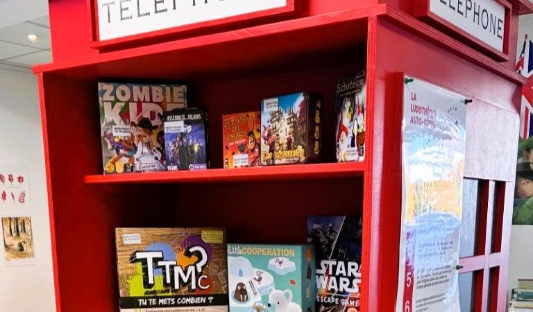 Faute d’espace disponible dans la médiathèque, les jeux sont disposés dans un meuble déjà présent dans l’équipement : une cabine téléphonique d’inspiration anglaise fabriquée par les agents techniques, qui a servi dans un premier temps à ranger les ouvrages anglais de la médiathèque. Aujourd’hui, elle sert de rangement pour les jeux de société, grâce à ses quatre étages et à son tiroir qui fait office de stockage pour permettre la rotation des jeux.