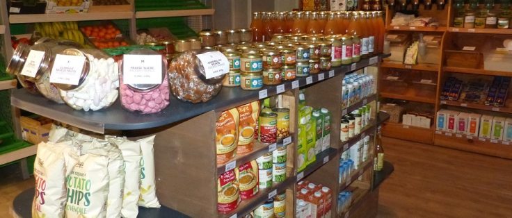 Les nouveaux gérants se fournissent auprès de producteurs locaux et bio et passent contrat avec l’entreprise de distribution « Biodis » qui alimente exclusivement les petits commerces. Ils privilégient les produits en vrac (coûts et déchets moindres). Le pain vient d’une boulangerie de Plouguernevel et deux boulangers bios fournissent aussi leur production plusieurs fois par semaine. Les heures d’ouverture sont importantes : 6 j par semaine (fermeture le mercredi) de 8h30 à 13h et de 15h30 à 19h (lun/jeudi), 21h (mardi) ou 22h (vend/sam).